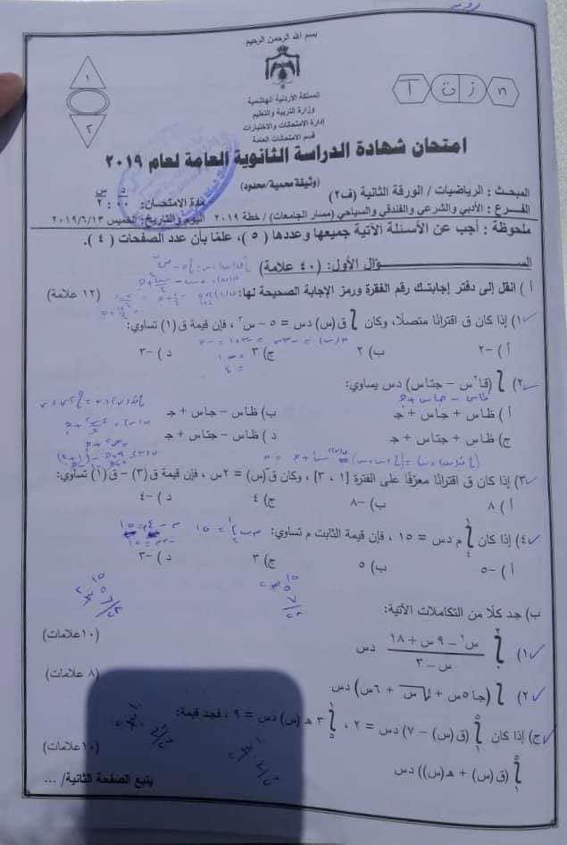 بالصور ملف Pdf نموذج امتحان الرياضيات الفرع الادبي الثانوية العامة توجيهي مع الحلول الفصل الثاني ليوم الخميس الموافق 13 06 2019 منتديات صقر الجنوب